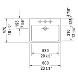 DURAVIT 0454600000 Vero® Furniture Washbasin With Overflow and Faucet Deck, Rectangle Shape, 23-5/8 in L x 18-1/2 in W x 6-1/2 in H, Wall/Above-Counter Mount, Ceramic, White